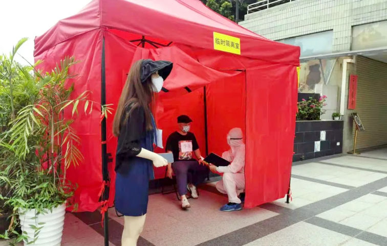 ▲工作人员在隔离区对身体不适的学员进行检查和了解情况