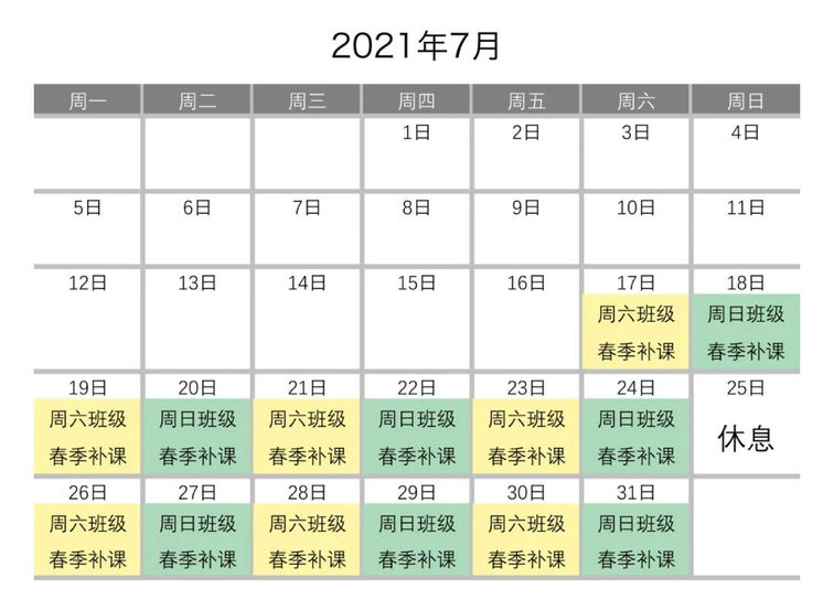 周日班上课时间:7月18日、20日、22日、24日、27日、29日、31日。