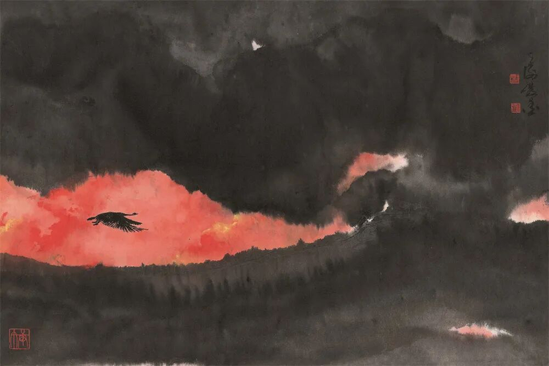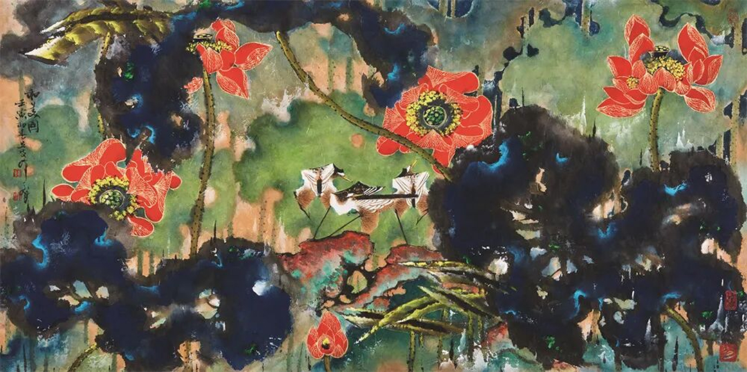 韩天衡先生作为当代海派艺术的领军者,其四岁习字、六岁治印,艺术道路至今八十余年,今日尚自诩“老学生”,其绘画、书法、篆刻各成高峰独树一帜,又彼此贯通。在绘画上,他与多数篆刻家、书法家仅“以书入画”的简笔创作不同,韩天衡的绘画题材覆盖水墨和重彩。在构图上参考篆刻布字的疏密有致,在线条上使用书法笔墨的圆润健挺,在绘画意趣上传承唐宋古典意趣,在色彩上兼容西洋色调的浓烈饱满。他所创造“韩鸟”的意象,自诩是读过三年书,兼具文气与灵动。