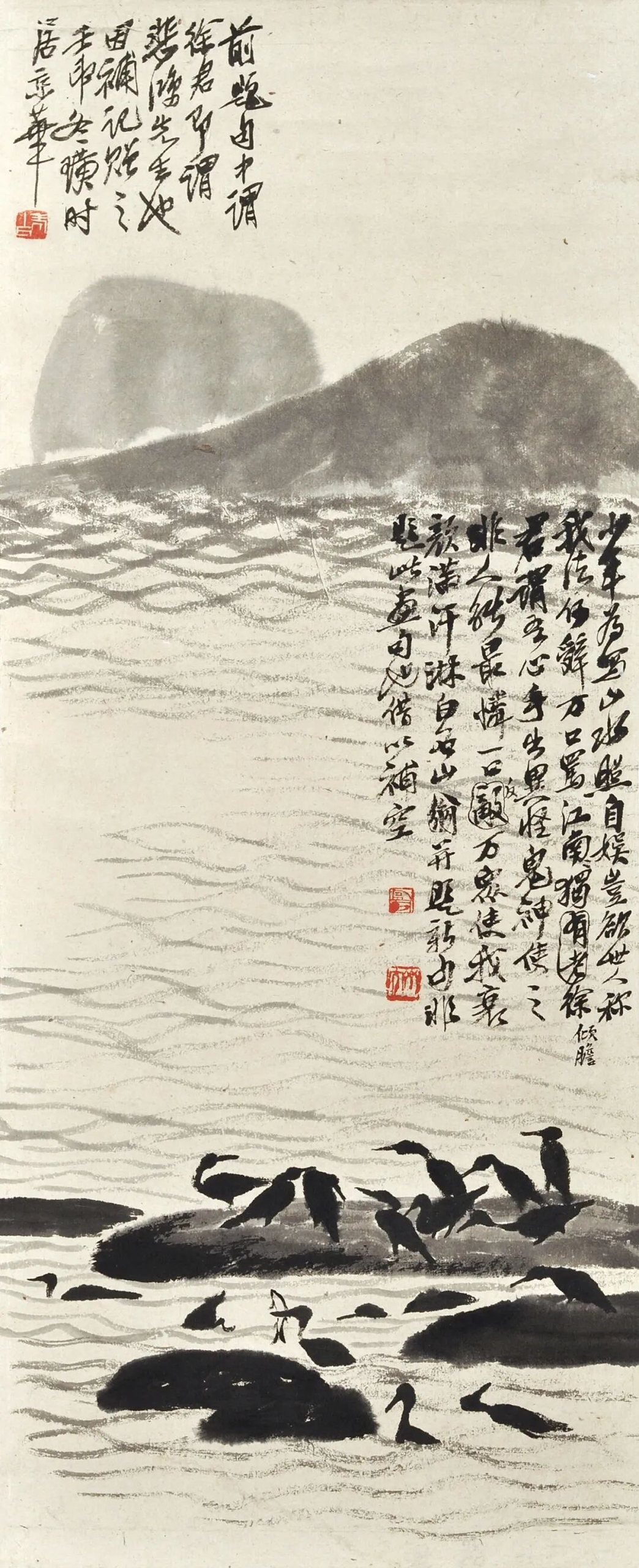 徐悲鸿补题:春水绿㳽漫,春山秀色含。一帆风信好,舟过万重峦。本世纪初,余方苕龄。先君达章公载余赴潥阳,过寄陶趾祥先生家,舟经宜兴东西氿,写景咏此。将五十年,犹能记忆。此画上虚一纸,为识此事。白石翁画约在1940之际,越二十余年重装。悲鸿。
