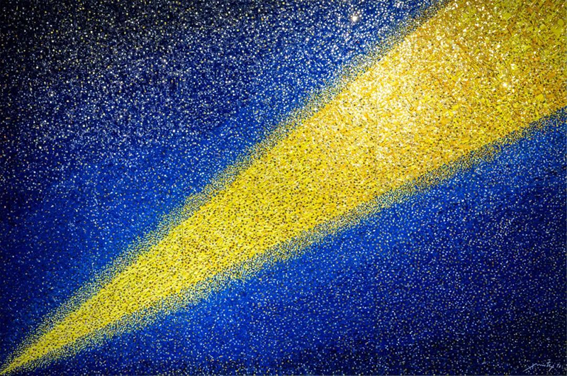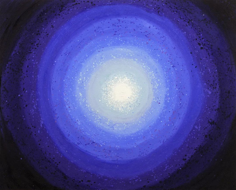 “光”是萧勤长达七十年的创作中贯穿始终的符号性元素,成为他作品中对生命歌颂和对宇宙能量致敬的意向。自60年代米兰“庞图运动”时期中所呈现的宇宙能量主题,“小我”与“大我”的圆融合一;90年代女儿莎芒妲的离世,成为萧勤艺术生涯的转折点,亦是希望之光哲学升华的契机。在《轮回系列》中,他以水墨晕染出层层叠叠的圆形结构,象征生命如涟漪般在宇宙中永恒流转;在《明光》系列里,金色与钴蓝交织成星云般的色域,佛教“涅槃”思想与量子物理的“能量场”在此碰撞,将个人丧亲之痛淬炼为对永恒之光的形而上追寻。这些作品不再是简单的抒情,而是建构出“悲伤—转化—重生”的精神拓扑学,用视觉语言演绎“无常”中的“常”。萧勤在生命最黑暗、最神秘的领域中发出了壮丽的光芒,表明了他对“希望”的领会。