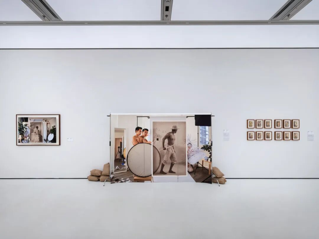 《照相馆》采用“档案-身体-空间”的三重叠加方法: 艺术家将殖民档案中的华工影像放大为真人尺度的照片背景,在自己的居所中精心置景——植物、家具、织物等日常物件构成一个充满个人记忆温度的剧场空间,然后以自己的身体介入这个历史-当代的交界面。这种创作方法论不同于其他艺术家对档案的直接挪用或对传统工艺的复兴,而是通过“身体的在场”将历史图像转化为一种可被重新体验的物质-空间装置。