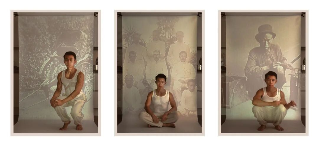 This part of the Eastern Promise series employs a tripartite method of "archive-body-space" superimposition: the artist enlarges images of Chinese laborers from colonial archives to life-size photographic backdrops, carefully staging scenes within his own residence—plants, furniture, textiles, and everyday objects compose a theatrical space imbued with the warmth of personal memory—then intervenes with his own body at this historical-contemporary interface. This creative methodology differs from other artists' direct appropriation of archives or revival of traditional crafts; rather, through "bodily presence," it transforms historical images into a material-spatial installation that can be re-experienced.