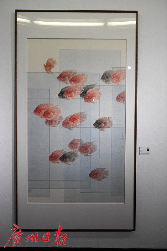 3、花鸟画方向的作品《翛然》,以鱼和块面的玻璃构成整个画面,一种崭新的观念在作品中呈现,开启了想象力和创造力在视觉中独特的规律内涵。具有形式美感的意境,巧妙的间隔排序变化来完成空间上的转换,给人一种简洁、明确自由轻松的境界。