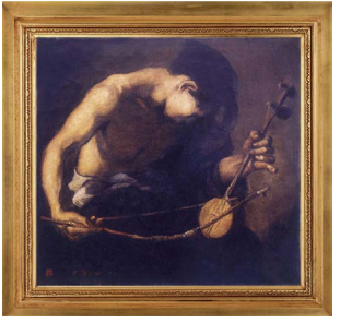 《奏出人间的辛酸》创作于上世纪30年代,作品原名《拉琴者》,是余本在加拿大多伦多安德里奥省立艺术学院求学期间创作的一幅脍炙人口的作品。早年余本在加拿大生活较为艰苦,曾经需要依靠在堂叔的餐馆打工来维持生计。而画中的模特,正是当年与余本同在餐馆谋生的一位台山青年。在这幅作品中,我们可以清楚地看到,这位模特赤裸上身、俯首拉胡琴的身影。画面中,单向的光线从左上方直泻而下,勾勒出拉琴者劳动过后的肩胛、手臂和脸颊,而他的脸部则整个陷于阴影之中而看不清。相信通过模特系在腰间的粗布腰带以及余本巧妙的构图,观众们不难感受到这位劳动者凄苦的心境。可以说,《奏出人间的辛酸》不仅画出了拉琴者如怨如诉的弦音,更反映出了早年海外华工迫于生计在加拿大从事体力劳动艰辛而无奈的生活。这幅把个人生活推向社会高度的作品,当年一经发表便大获成功,先后参加了1931年加拿大博览会,1932年加拿大皇家艺术博览会和1933年的多伦多世界博览会。这件作品是余本早年的成名作之一,它与同时期创作的《月琴》、《希望》等作品代表着余本从一位留学青年向着职业画家的转变。