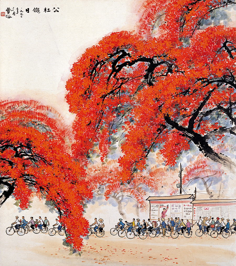 林丰俗《公社假日》画面上最引人瞩目的,是那一大片惊艳的凤凰花。鲜红刺眼的花海,乌黑遒劲的枝条,淡淡的绿色枝叶,搭建起一片世外桃源。凤凰树开花的时候,正是广东的春末夏初。在这样美好的时节里,每逢假日,人们总会相约出门游玩,度过一个愉快的假日。墙报栏上的体育活动、文艺演出、电影信息,暗示了当时人们的休闲去处。艺术家通过精巧的构思,把传统山水画法与当时的生活细节结合,描绘出洋溢着浓郁的生活气息的假日情境。