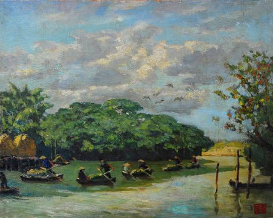 从《小鸟天堂》的画面中我们可以看到,澄澈的水面上掩映着霞光,一艘艘满载丰收稻谷的农艇成群结队地从小岛旁经过,鸟儿正自由自在地向岛中心飞去。细心的观众可能会发现,《小鸟天堂》所描绘的风景和巴金笔下的《鸟的天堂》有异曲同工之妙。没错,它们反映的都是广东四会小鸟天堂的秀丽景色和那里人们的劳动生活。其实在创作这幅作品时,余本曾对色彩基调斟酌再三,并多次修改了画面的构图,最终才决定采用满载稻穗的农艇和结队归巢的小鸟来刻画最富诗意的农村生活。从余本对作品的易稿再三、推敲入微中,我们不难看出他精益求精的创作态度。许多人见余本是个多产的画家,便理所当然地认为他的作品多是信手拈来,这种理解多少有些一知半解。余本常说:“一幅画写来并不太难,但下笔前要先想到圆满的解决却实在不容易。有些画稿因为老想不通,长期搁笔不能写的情况是常有的。”他总是能严格地对待每一件作品,从来不会漫无目的地玩弄颜色任意涂抹。正是这种令人敬佩的精神让余本先生创作出了一系列多脍炙人口的作品。