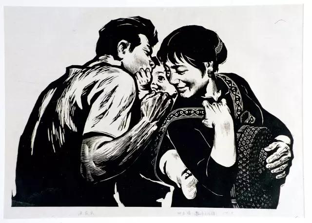 微信菌找到的第二张作品,是林仰峥的黑白木刻《爸爸在工作》。新中国建立后,人民群众对于国家的发展怀有空前的热情,尤其是工业方面的建设。林仰峥的木刻作品《爸爸在工作》正展现了这一时期的家庭生活一隅:画中的父亲正在灯下努力工作,书桌上放着一张图纸,似乎说明父亲的身份是一名工程师或是工人。窗外远处的工厂烟囱正在排气,显示工厂一直运作到深夜。窗户的旁边是一枚用图钉固定在墙上的海报,海报上画着一个正在调零件的工人。房门处,他的妻子拉住了想要找父亲玩耍的孩子,用手掩着嘴,小声地劝阻孩子“不要打扰爸爸工作。”微信菌小时候也曾经历过这样的场景,你呢?