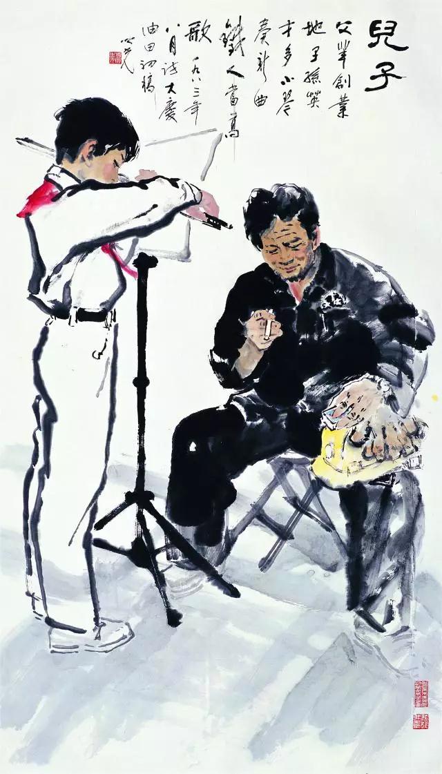 杨之光的水墨画作品《儿子》展现的是新时期下的父子关系,画作选取的也是一个非常日常的场景。虽然题目为《儿子》,但画中父亲的形象更占画面主体,父亲身着工人制服,腿上放着手套和安全帽,右手持着一根点燃的烟,坐着认真听儿子拉琴;儿子穿着学校制服,戴着红领巾,专注演奏;整个画面极富叙述性。画上题跋“父辈创业地,子孙英才多,小琴奏新曲,铁人当高歌”正是画家心声的表达,也为我们展现了那个时代背景下普遍的父子关系。