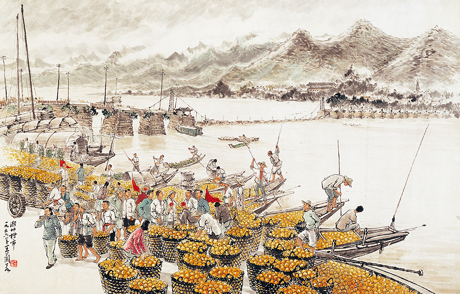 画中人物的衣着打扮符合二十世纪五十年代的时代特点。画面近处停泊了许多小船,船上载满了金黄色的柑。“柑”是潮汕地区的特色水果,寄寓着吉祥的心愿,也是潮汕民俗文化的代表物。远处江上的桥,是潮州的地理和文化标志建筑——湘子桥,又称广济桥。湘子桥集梁桥与浮桥于一身,乃“中国四大古桥”之一,迄今已有八百多年的历史。自清代始,湘子桥沿岸一直是商贾聚集之地。王兰若在《潮州柑市》中描绘的是新中国成立后湘桥市集繁荣热闹、井然有序的景象。