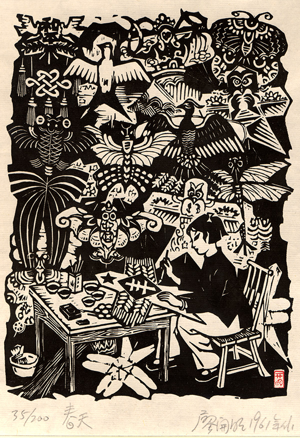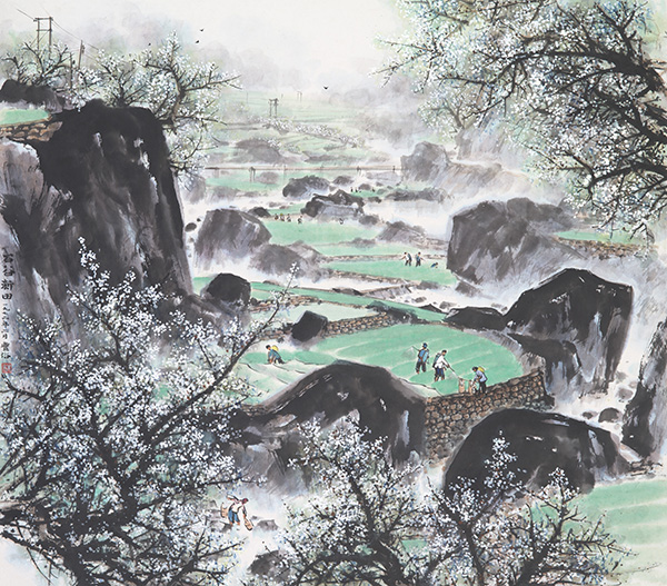 在花丛之中,虫儿也开始忙碌。陈卓坤用停在花朵上的蝴蝶“寄意春色到人间”,司徒奇看到了蜜蜂们在“花开时节采蜜忙”。常言道“一年之计在于春”。在林丰俗的《石谷新田》中,农民在温润的天地间,古拙的山谷里开始了劳作。廖开明的《春天》记忆是满屋子的风筝,黄云看到的是“忙趁东风放纸鸢”的孩童。