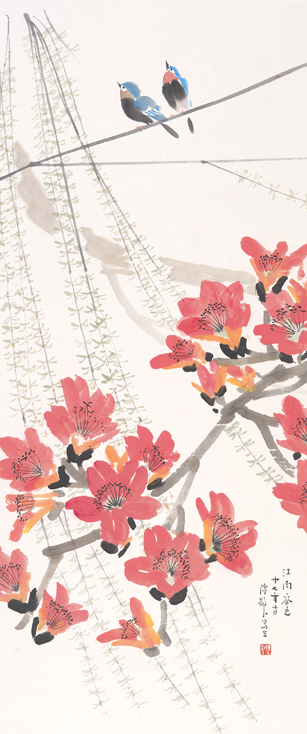 在陈树人的《江南春色》里,粗细不一、交叠有序的枝条,就像是大自然的五线谱;点缀其上的红花是沉稳的中音、低音音符,两只翠鸟就是两个高昂的高音音符。画家就像用画笔当作指挥棒,给我们演奏着美妙的春之声。艺术家对自然的热爱,溢出画面,沁入人心。