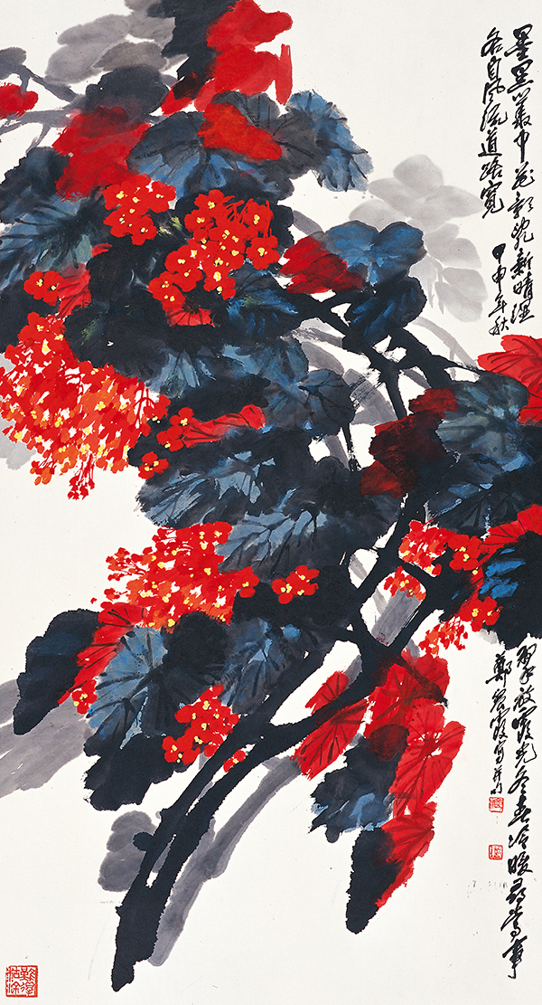 他的画作《新晴湿翠》以一条弯曲的枝干引出叶丛中盛开的海棠花,鲜红与浓绿碰撞在一起,浓重中透露着轻盈。画作背景处淡墨色的花影,暗示了此时正是晴天;叶片上的墨色与青色给人以水汽在阳光下闪耀之感觉,这一切将海棠花衬托得更红艳。艺术家借海棠花以言志,画作题诗曰:墨黑丛中花怒放,新晴湿翠泛霞光。冬春冷暖寻常事,各自风流道路宽。