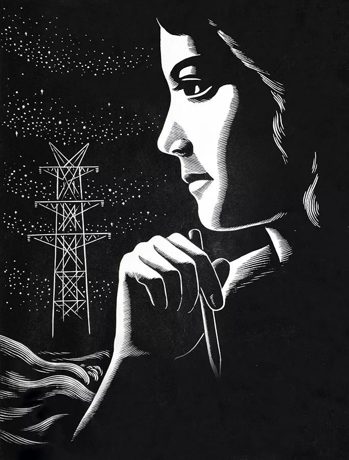 《年青人》是一幅优美的抒情版画,对人物的特写处理与强烈的黑白对比是这幅作品的显著特色。满天的星斗,辽阔的大海,代表科技建设的高压电线架,都是富于象征性的细节。手持铅笔的年轻人正在沉思,面带神秘的微笑,洋溢着年轻人的朝气,对未来的理想,以及青春的不可战胜。黄新波通过人物塑造,对年轻人寄托真诚希望,表达了对国家未来的期待:拥有高度发展的科学与文化才有光辉的未来。