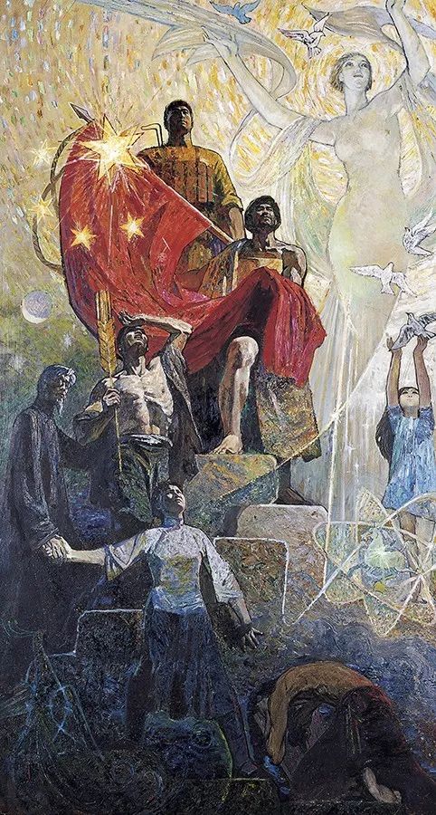作品用象征性的纪念碑图式,各历史阶段各阶层人物盘旋上升,迎接光明。用“解放”这个题目,一语双关。