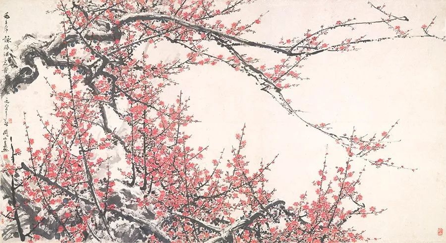此幅作品颇具时代风貌,关山月充分发挥了营造整体氛围的艺术语言技巧,枝干以篆书笔意写出,梅花以没骨法点成。这种朱砂写花、焦墨作干的方法使画面形成强烈的反差,从而突出了笔墨的力度和层次,使画面在视觉上出现了更为丰富的变化,表现出磅礴恢宏的气势和疾驰速动的节奏。画面中朵朵俏丽的红梅、挺拔向上的枝条、浓烈的色彩和雄健的笔力,都一反古人画梅清疏淡雅的气质,创造出一种奇崛峥嵘、勃勃生机的梅花形象。