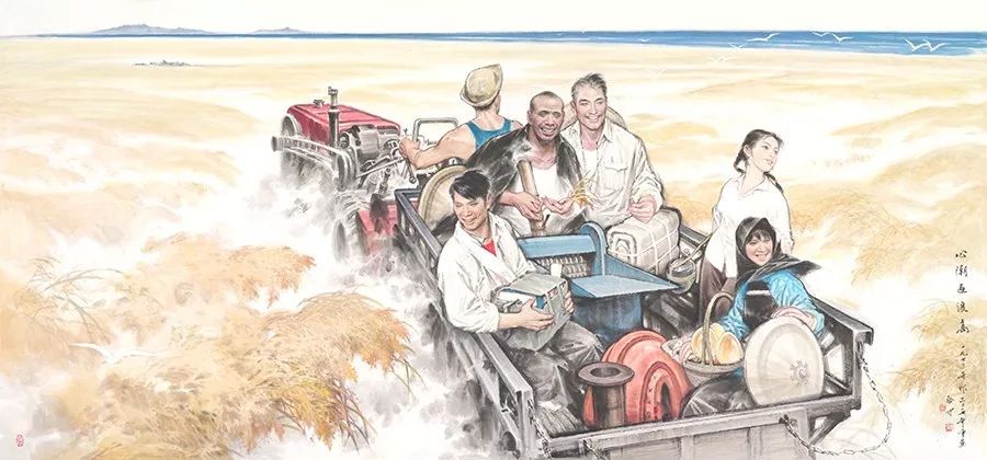 作品表现的是知识青年下乡的图式场面。该幅画一眼望去气势恢弘,鲜红的手扶拖拉机驰骋在广阔无垠的金色海洋里,劈开谷浪,滚滚前进,与远处一线平展的海面相呼应。从画面中洋溢出来的那种乐观、健康和具有很强南国色彩的组群式人物,不仅个性鲜明、有血有肉,还具有强大的生命力和感染力。