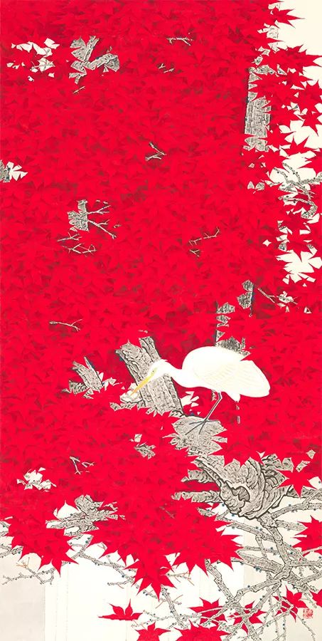 《枫丹白鹭》在笔法、色调、构图、立意中处处见诗情。大片红彤彤的枫叶几乎统摄整个画面。利用枫叶的错落布局衬托出白鹭的主体轮廓,蓊郁、灿烂、幽深、静谧的天然生趣油然而生。