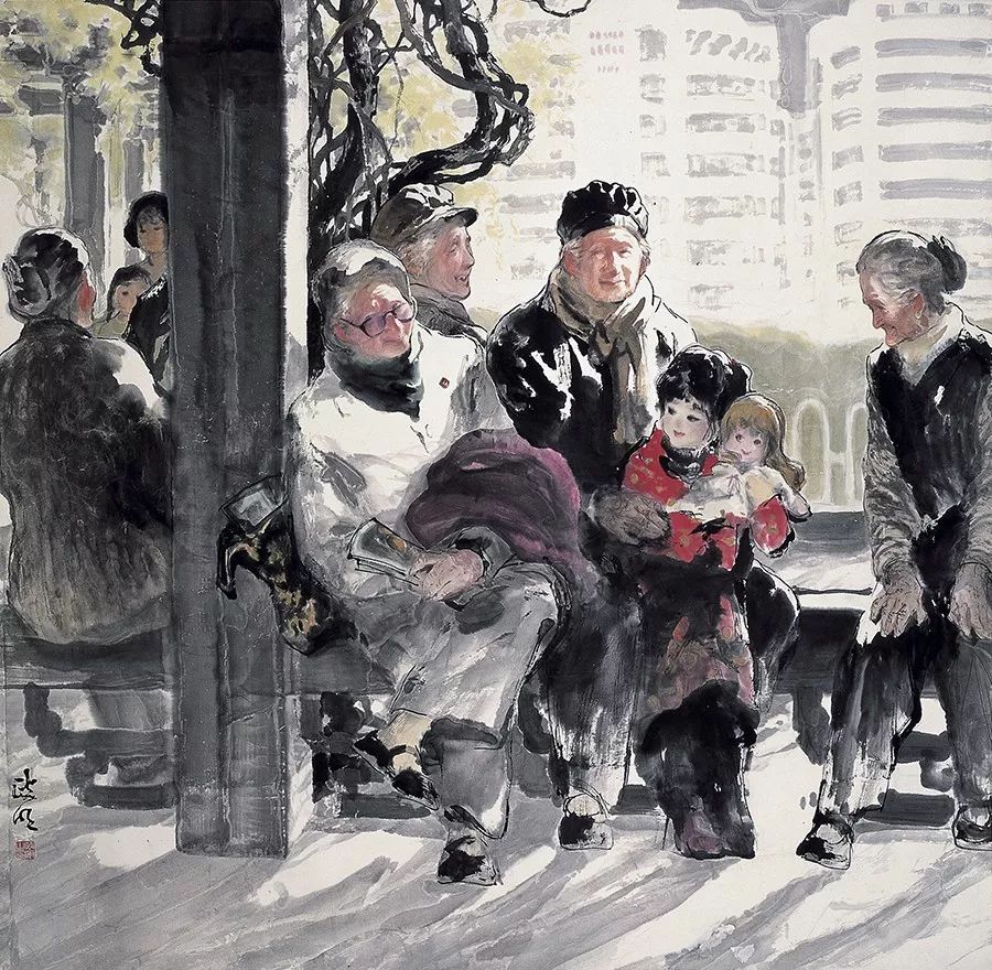 《冬日融融》描绘了一群在冬日阳光下带着儿孙欢聚的老人。人物表情祥和生动,画面糅合西洋光影和东方笔墨的表现技巧,以留白的方式表现冬日暖阳的光影,透明灿烂,表现了改革开放以来人民过上了富足安定的生活,具有浓厚的时代特色。