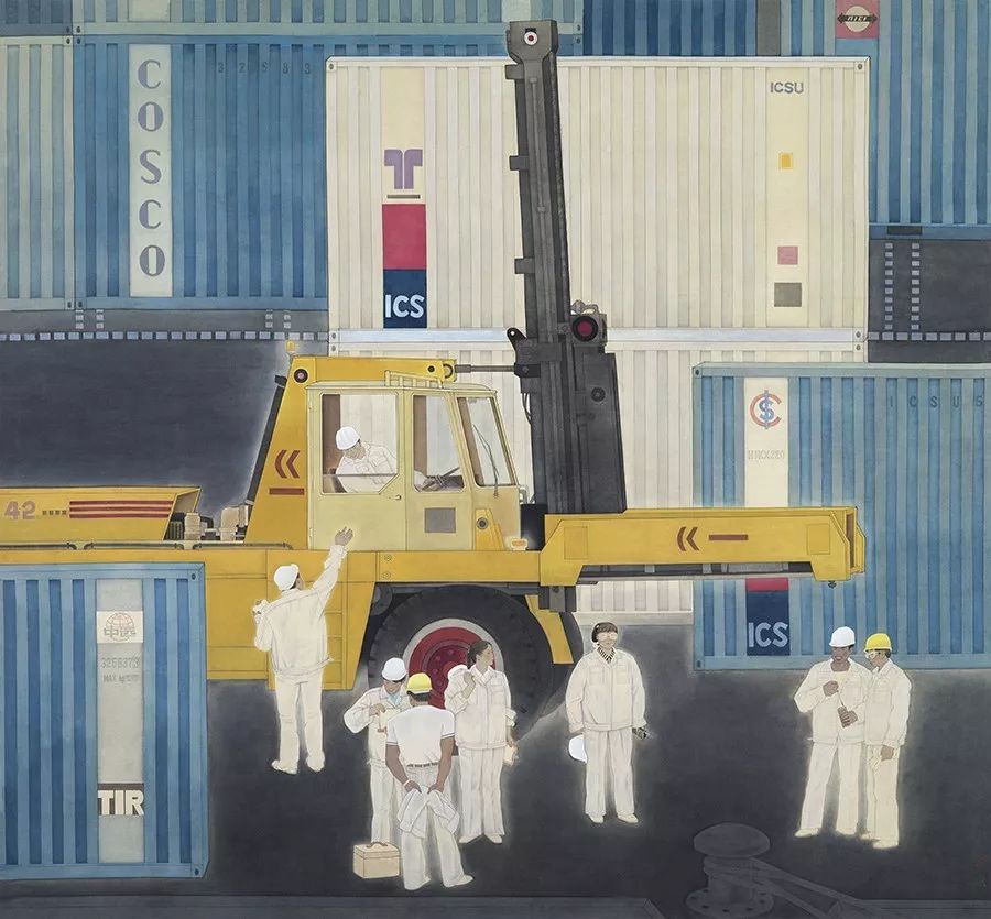 《新港》是1984年张弘和马文西一起创作的以城市为题的画作,改革开放的生活环境直接给予了他们创作的灵感。《新港》的创作背景是指广州的黄埔新港,每天堆放着成百上千个来自世界各地的集装箱,工人们在忙碌地操作叉车,当时中国画以城市、工业风格为题材的相对比较罕见,张弘说:“我们在色彩和构图上运用了荷兰画家蒙德里安的‘冷抽象’,在人物的处理上,参考了日本工笔画的某些表现手法,为了让集装箱的装饰性直线条在画面中不显呆板,我们在渲染上则采用了中国画的虚实处理。”