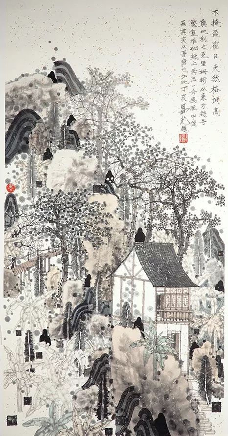 作者卢延光曾说道:“我的山水画喜欢用工整的圆点,大概此种意韵从奥地利的克里姆特那里来。克里姆特的人物、风景多用大大小小的圆点来衬托或表现,一种朦胧与斑驳感跃然纸上,这很适合我追求的现代味道。我的山水画里各种各样大小工整的圆点,代表青苔、树叶,甚至什么也不代表,只是节奏,圆点中都用清水染一次,让它有幻化的感觉。因为工整,便使山水画带一种中国的装饰风,更与历代各位画家的苔点或乱头粗服,或精雕细刻或狂放不羁有了区别,理性的、工整的、有节奏的圆点再加清水一冲,别有一番滋味在心头。”