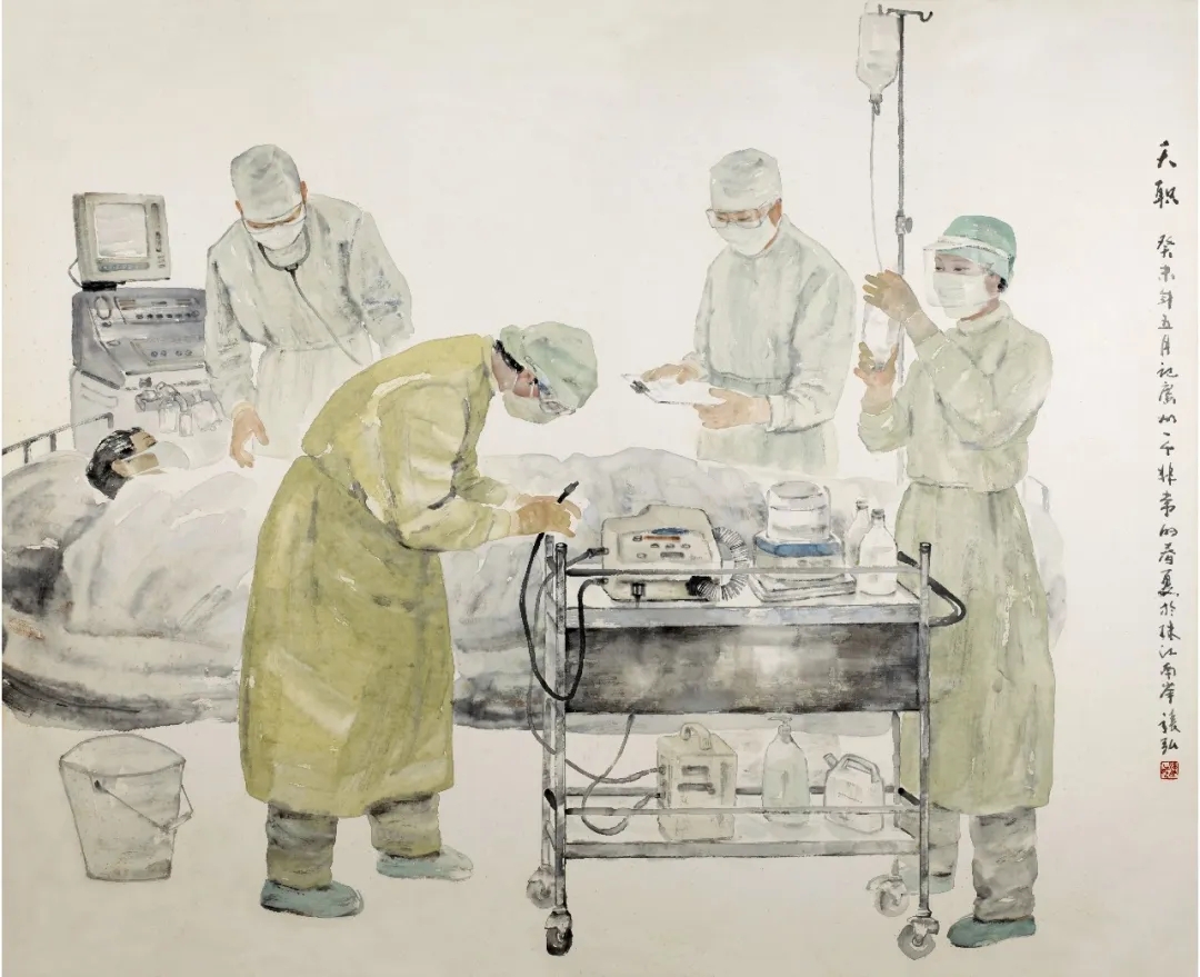 作者回忆:我在市第一人民医院的缓冲区,花了好长时间穿上2-3层隔离服,扎紧袖口与裤腿,戴上护目镜,顿时感到整个人臃肿迟缓了不少,手持保鲜纸包好的相机,感觉快门也没有平时灵活,而且视线极容易模糊。进入隔离区,通过走廊上的玻璃,我可以比较清楚地观察到病房间的设施以及医护人员救治病人的场景。这次亲历,让我印象深刻而感动。不久,我便顺利完成了中国画《天职》的创作。作品我采用写意的手法,以没骨的形式来表现,画中大面积留白,既与医院洁白的环境吻合又突显白衣天使的形象。