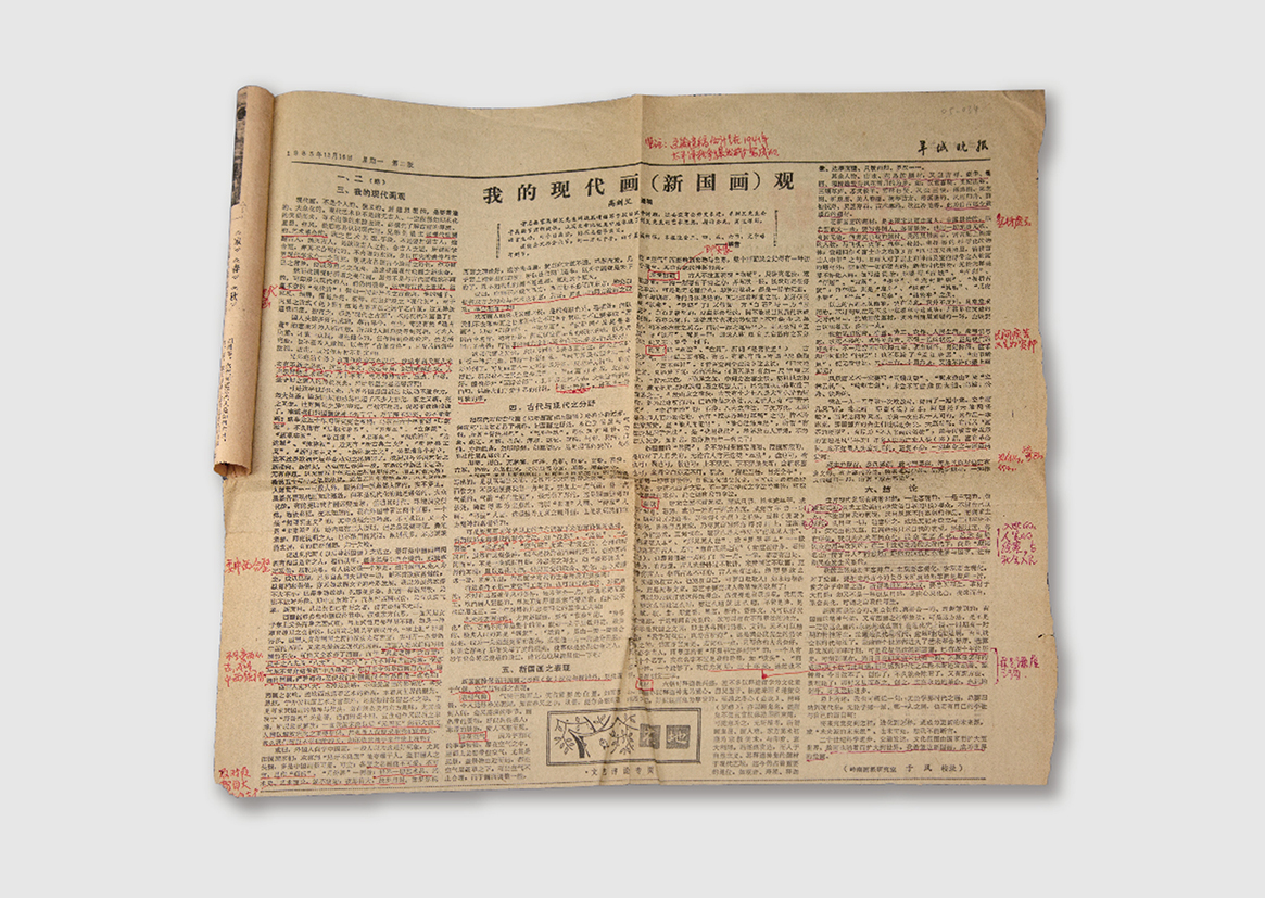 大大小小的剪报,黄志坚珍而重之。他收集的报纸,内容大多与岭南画派有关。其中一份为于风整理的高剑父手稿,以《我的现代画(新国画)观》为题节选发表于《羊城晚报》。原稿高氏以铅笔书写,后又佚经修改,再经数次整理印行。这份文献的重要性,从黄志坚不仅将报纸保存完好,并亲笔在上面作了大量的研究批注可见。对于不少研究岭南画派的研究者而言,他们需要通过收集和阅读文献以理解高剑父对于中国画改造从原则到方法的渠道,并且需要对文献进行甄别、推敲,正视文献正负两面的价值,形成研究角度和观点,推动近现代美术史的研究。