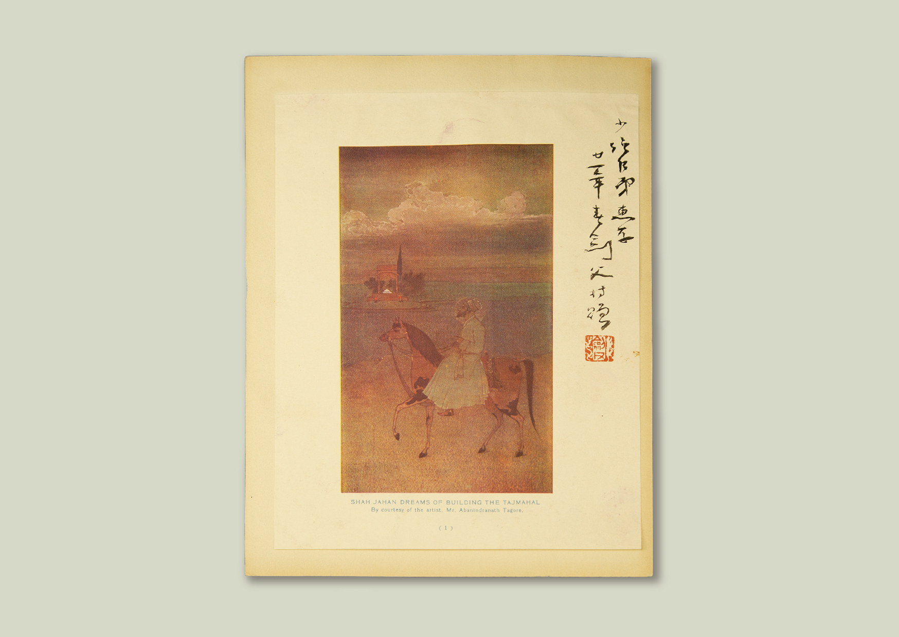 1930年代初,高剑父曾游历南亚印度等地,考察异域民族之艺术。一页高氏于1932年题赠其弟子黄少强的印度画片,印刷的作品为印度诗人罗宾德拉纳特·泰戈尔(Rabindranath Tagore)侄子阿巴宁德拉纳特·泰戈尔(Abanindranath Tagore)《沙贾汗梦见建造泰姬陵》(SHAHJA⁃HAN DREAMS OF BUILDING THE TAJMAHAL),呈现孟加拉画派注重光影和朦胧诗意气氛的特点。画片作为文化艺术传播与交流之物,从侧面反映了高剑父与泰戈尔家族的交往史实,也为研究者考释高剑父特定时期新国画变革的视觉经验来源提供图像依据。