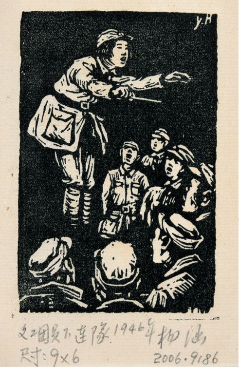 1946年正值杨涵艺术创作的黄金时期,除了原有的关注军民农业生产的题材外,他也创作了许多描绘部队生活的作品,此幅作品便是来源于文工团员下连队慰问战士的一个瞬间,生动简练而又情趣盎然。杨涵的巧妙之处在于,他没有正面表现部队练兵、生产的场面,而是将视角转向其生活娱乐的场景,以此表现出战士们积极乐观的革命精神。