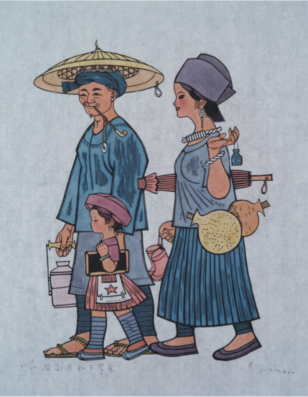 在黄永玉的《全家送我上学堂》里,土家族小女孩背着同一款五角星小书包,在爷爷和妈妈的陪同下走在上学的路上。家里人为小女孩准备了斗笠、雨伞,雨胶鞋、双层饭盒、大水壶、墨水瓶、小黑板,这是当时边远少数民族地区生活的真实写照。山区学校一般离家很远,学生上学需要自备午餐,晚餐。天雨路滑,山路难行,送孩子去上学,是一趟艰难的路途。在这样艰难的环境下,这一家人脸上依然充满笑意。黄永玉是土家族人,他对这些有很深感触。他为这幅画配了一首儿歌:“爷爷七岁去逃荒,爸爸七岁去放羊,今年我也七岁了,全家送我上学堂。”这短短四行儿歌,道出了时代的变迁,阐释了画作的主题。