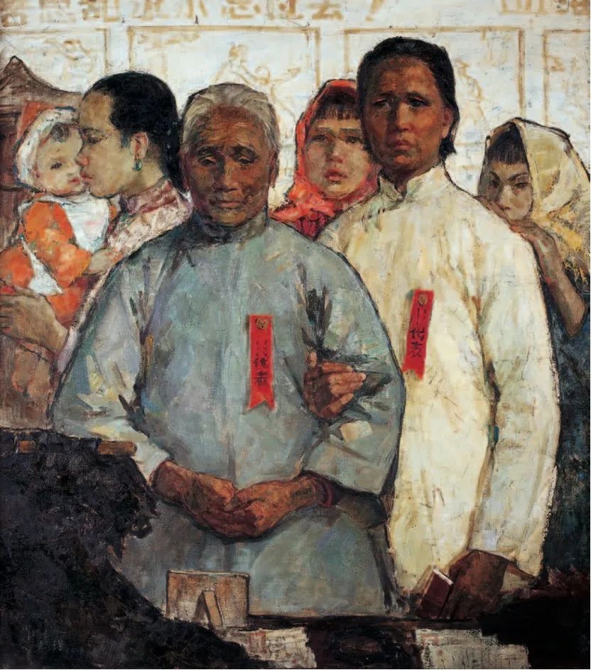 鸥洋首先提出“意象油画”,被艺评家评为“中国最早举起意象油画旗帜的人”,其作品为中国油画本土化提供了具有学术价值的范例。在画面中,老妇轻锁眉头陷入回忆的表情甚是动人,交叠的手暗示出内心的纠结;一旁的妇女亦陷入沉思,但哀伤的情感显露得更为明显,对老妇形成衬托,使人不免猜测老妇形象背景的复杂性,从而更为吸引观众的注意。整幅画面色调和谐而富有细节,笔触爽快而包含多种变化,人物立体干净,现场感强烈,是一幅值得学习的佳作。