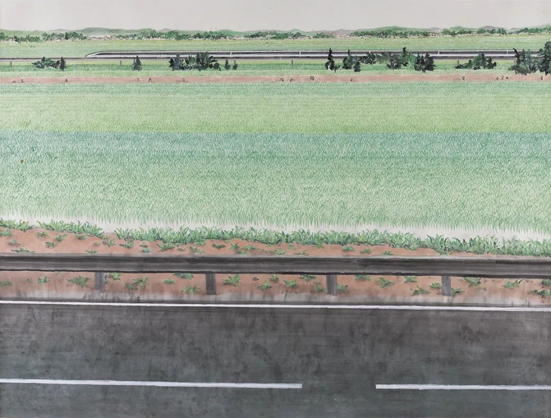 如今的中国大地上,常常可以看到飞驰的高铁和四通八达的高速公路在农田上穿过。这是属于我们这个时代的新风景,是我们古老土地上焕发的新生机。本作品据此进行创作,以表现我国经济、社会发展中取得的伟大成就。