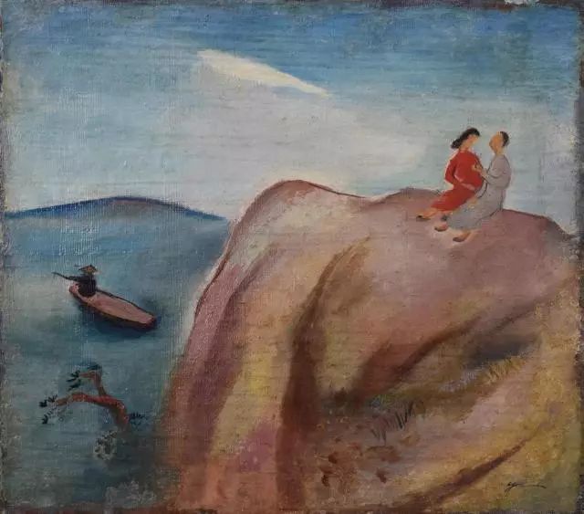 风景是谭华牧最热爱的主题和图像,他乐于用“旁观者”的眼光去观察和体验他生活的时代所特有的“诗意”。人物在谭华牧的画中,通常只是点缀风景的符号。这些灵动的人物元素给画作带来特别的情绪节奏和韵律,也带来了可供想象与阅读的故事。这种明显疏离20世纪中国美术主流的趣味选择,客观上也促进了谭华牧趋于稚拙、柔美的抒情风格的自我完善。