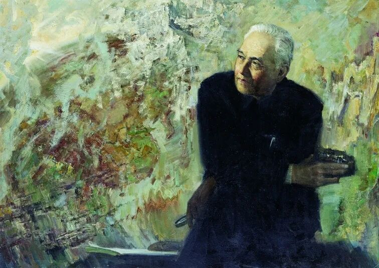 画面以一幅巨大的中国地质图为背景,刻画了李四光在工作室里手握矿石,思考的瞬间。通过这一块石头,李四光发现了大庆等油田,摘掉了“贫油国”的帽子。汤小铭巧妙地运用色彩与笔触,勾勒出地貌的瑰丽多姿。这不仅是对地质学家工作环境的真实再现,也寓意李四光所从事的地质事业如同这大地一般,既复杂多变又充满挑战。李四光正在思索,他睿智的目光射向远方,似乎在展望着祖国地质学的美好明天,也预示着科学发展春天的到来。