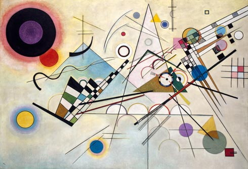 抽象艺术先驱康定斯基除了在抽象绘画上颇有成就之外,还是一位成熟的音乐家。人们认为,康定斯基具有极高的“通感”能力,能够将音乐和色彩融会贯通,这一能力对他的艺术产生了很重要的影响。康定斯基的许多作品都以音乐术语来命名,比如“即兴”(improvisation)和“构成”(composition),仿佛这些作品跟乐曲是一样的。《构成8》中的几何形状和线条,反映了康定斯基在俄国逗留期间接受的至上主义和构成主义影响。圆形和方形、直线和曲线,这些个性不同的图形之间相互照应,在视觉上营造出乐曲的活力。