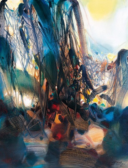 朱德群自转入抽象风格后,便以破竹之势挺进法国现代绘画的主流社会,成为连接东西方艺术链条上的一个新环节。其创作源于两种文化,却只有一个意图:用动人的色彩来构筑,让绘画通过自成的整体和自由的笔法说话。它能将身心合一,既是空间和光线,又是温暖与生命。他抒情而充满诗意的抽象绘画,被法国现代绘画史家称许为“把东方艺术的细腻与西方绘画的浓烈融汇得最成功的画家。”(朗迪)