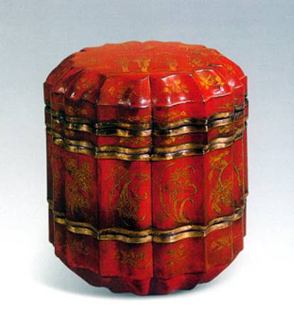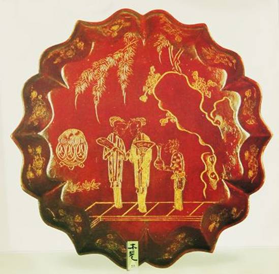 图23:南宋 人物花卉纹朱漆戧金花瓣式嶛