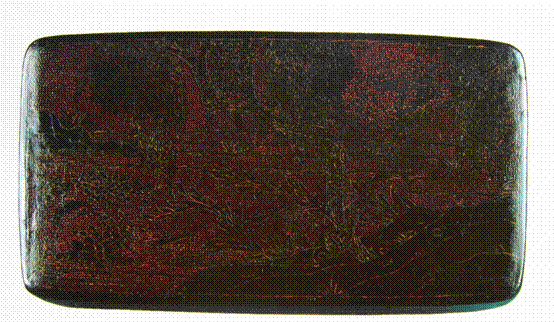 图21:南宋 山水花卉纹填朱漆斑纹地黑漆戧金长方盒