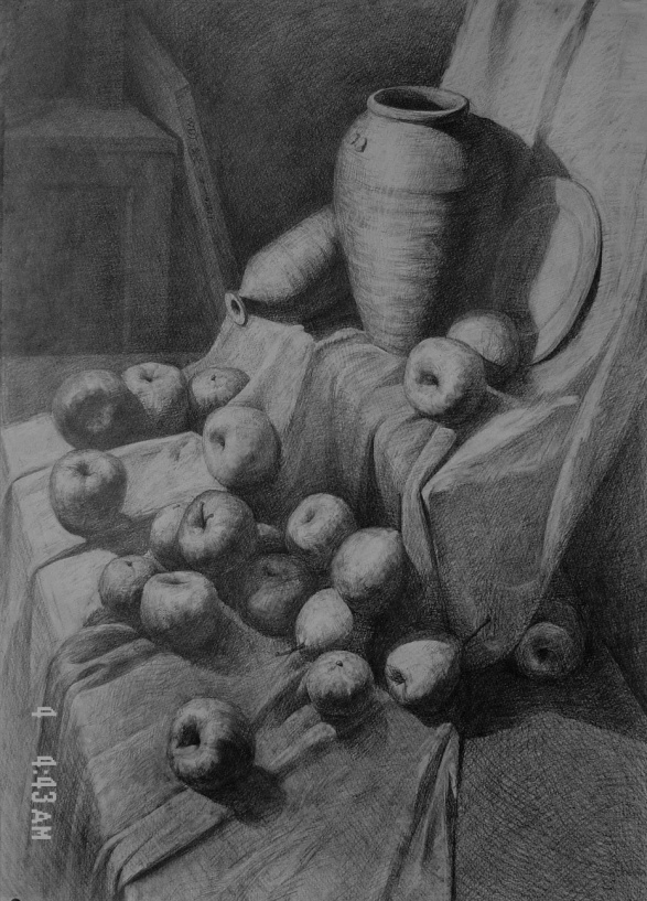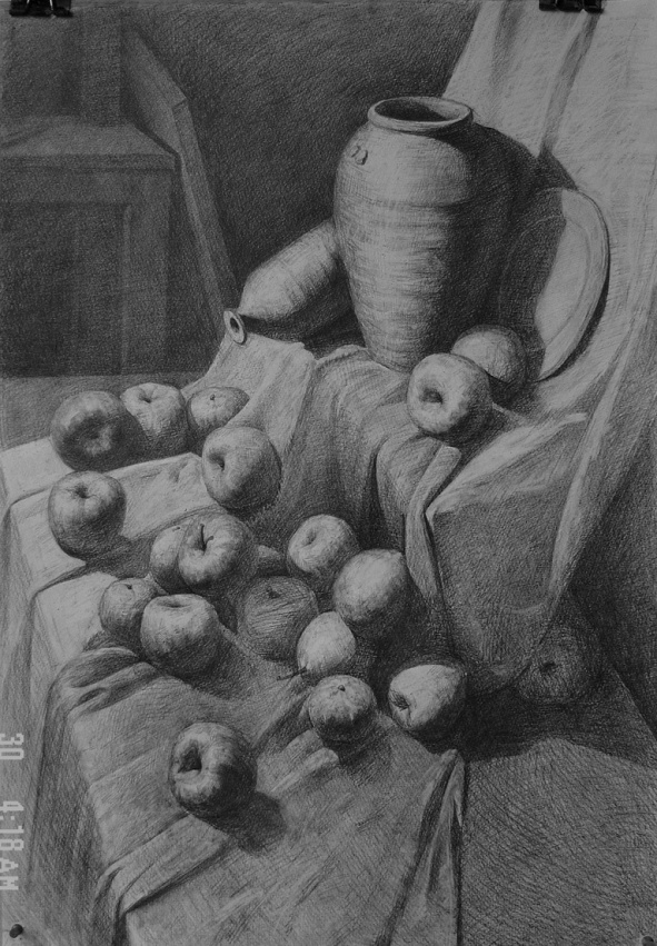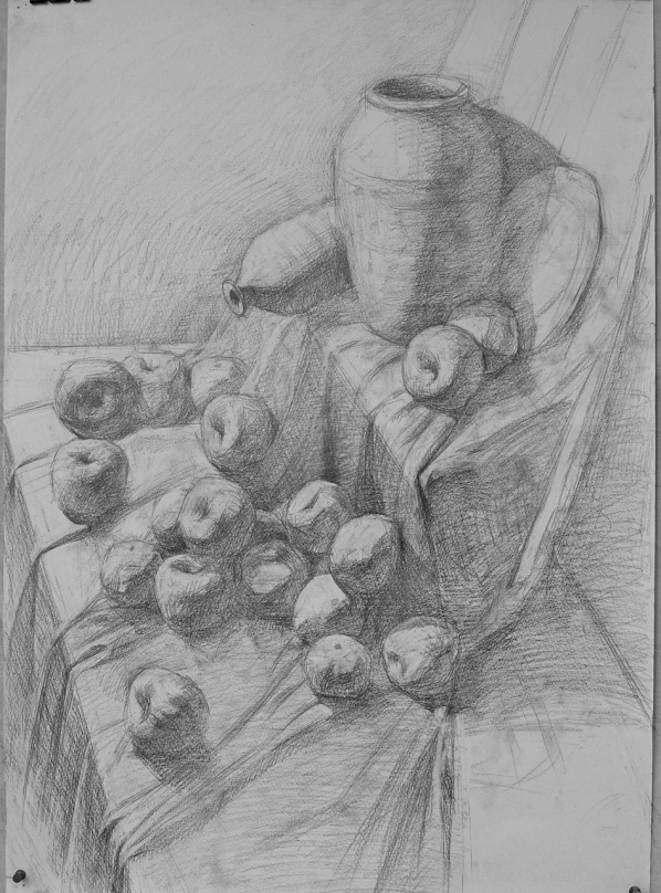 4.调整完成:深入刻划时难免忽视整体及局部间相互关系。这时要全面予以调整(主要指形体结构还包括色调、质感、空间、主次等等),做到有所取舍、突出主体。