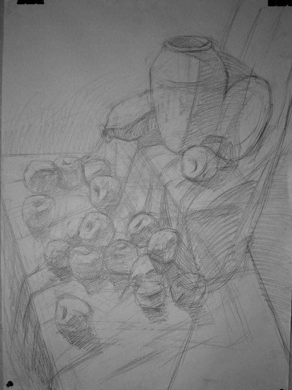 2.画出大的形体结构:用长直线画出物体的形体结构(物体看不见部分也要轻轻画出),要求物体的形状、比例、结构关系准确。再画出各个明暗层次(高光、亮部、中间色、暗部,投影以及明暗交接线)的形状位置。
