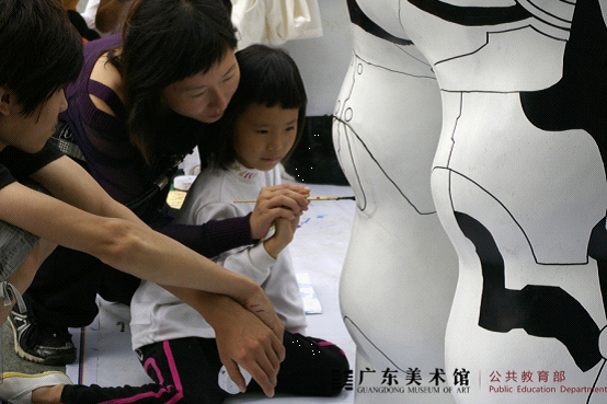 图12:一位小朋友忍不住要为机械羊涂上几笔,得到作者同意后,她的妈妈和她一起完成了这只羊腿部黑色块面的涂鸦。