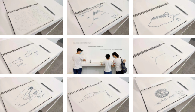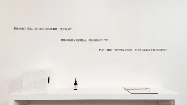 如果缺少了视觉,我们如何感知世界?我们会对物品有怎样的“印象”? 公共教育部多年来一直坚持为盲童设计“非视觉”的艺术课堂,我们和青年艺术家魏一目一起用盲童的作品设计了这个“盲摸盒子”。盒子藏了一件有故事的盲童陶艺作品。我们期待你用“看不见”的方式,用双手在黑盒中摸索,感知它的形状、材质,猜想它的样子,想象它是什么东西。互动区的留言本上,记载了大家的探索思绪与答案。