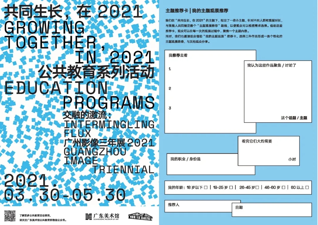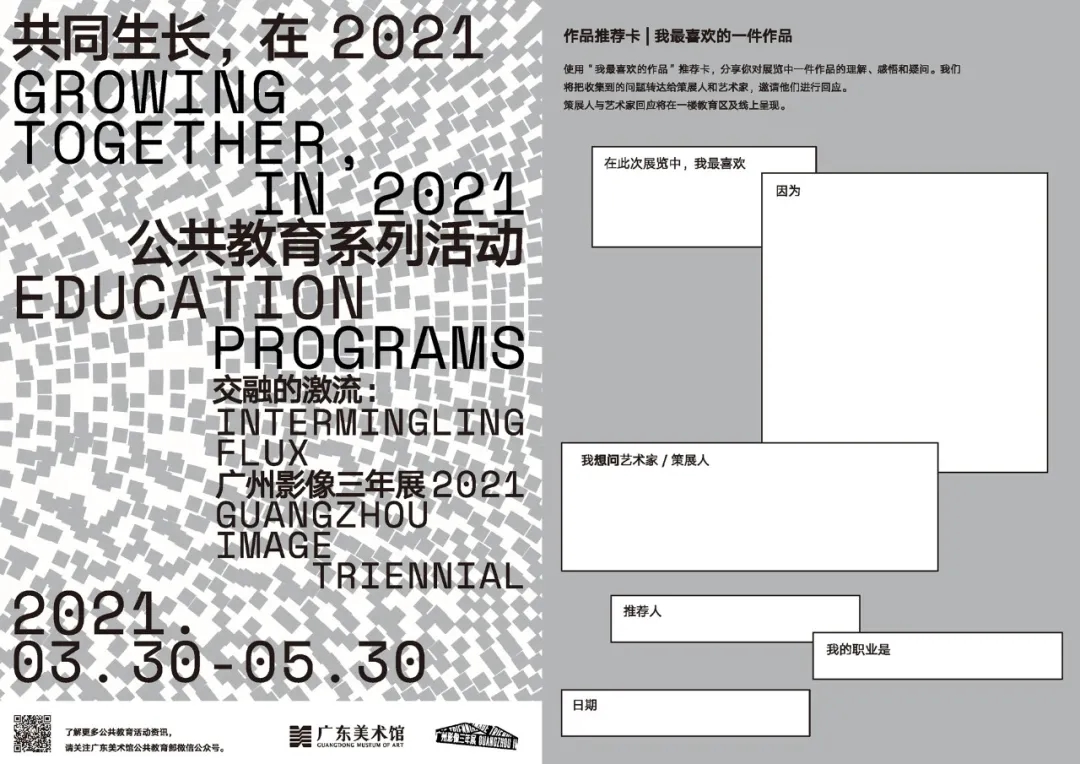 为了让观众有更好的观展体验,我们邀请策展人、艺术家、专业人士与观众一起用教育互动卡共享自己的“观展经验”,进行纸面、云端的互动,共同构建我们对“广州影像三年展 2021”的印象,组成观点交融的激流。