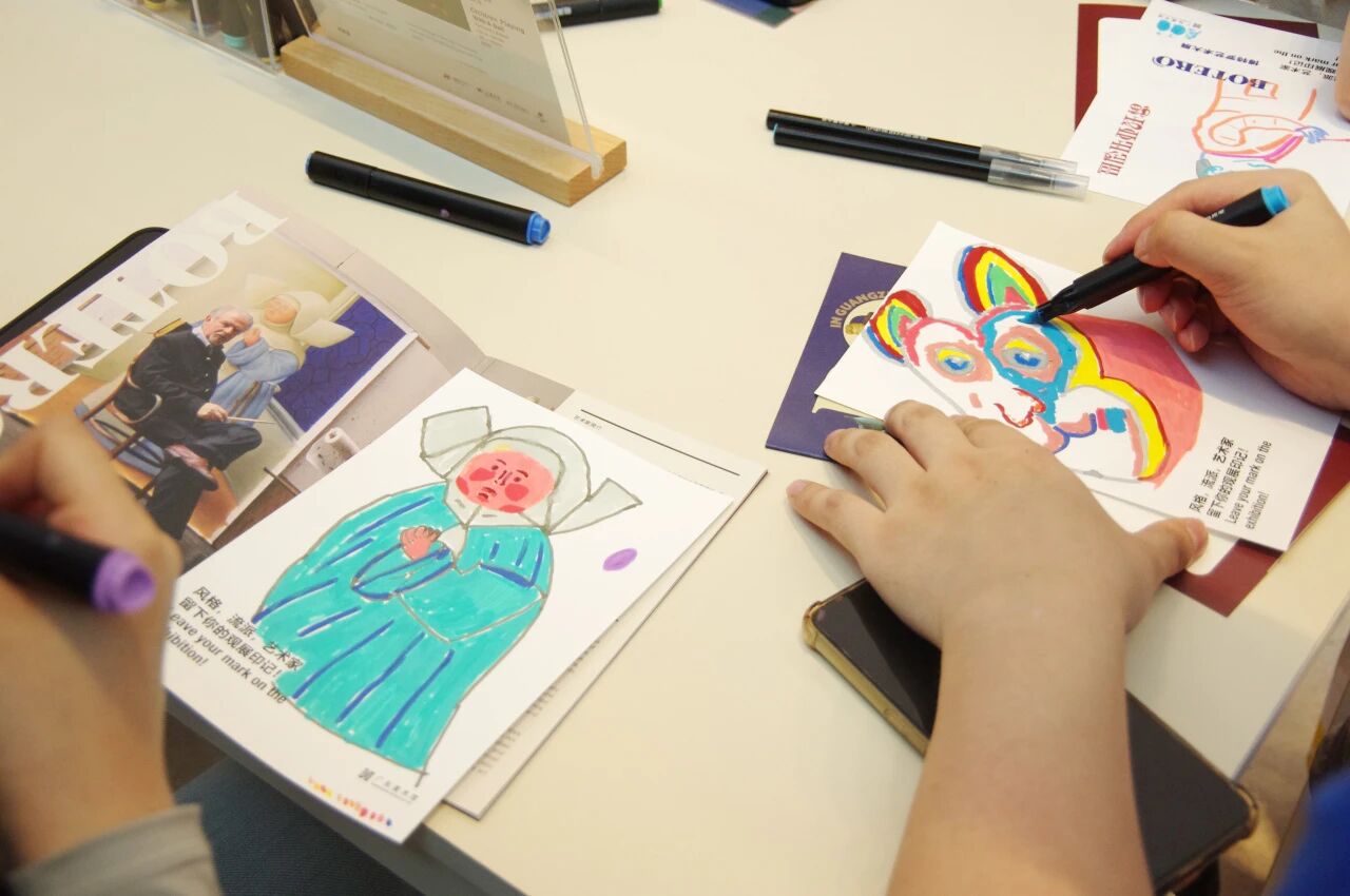 在漫游展览、观赏原作、聆听导览之后,交流与分享是最佳的观展体验“结束语”。为了让观众的感受与想法得以呈现,公共教育团队在本次展览期间,设计推出了多功能的公共教育互动空间。观众可以在这里与艺术家的自画像合影,集取限定版展览印章,参与多种类型的互动活动,通过投稿进行分享和交流。