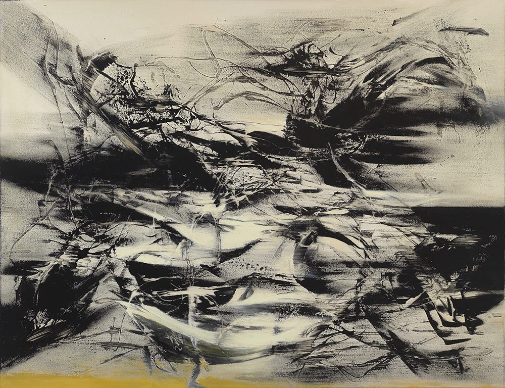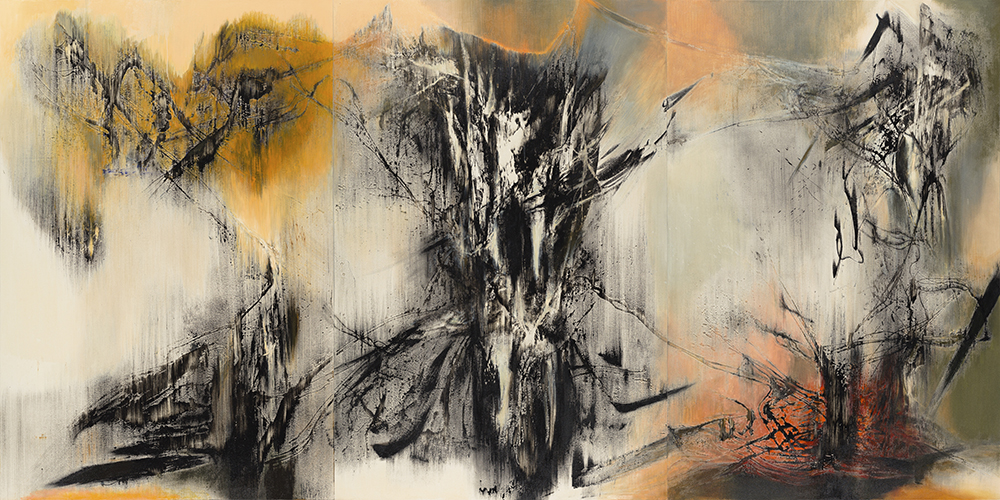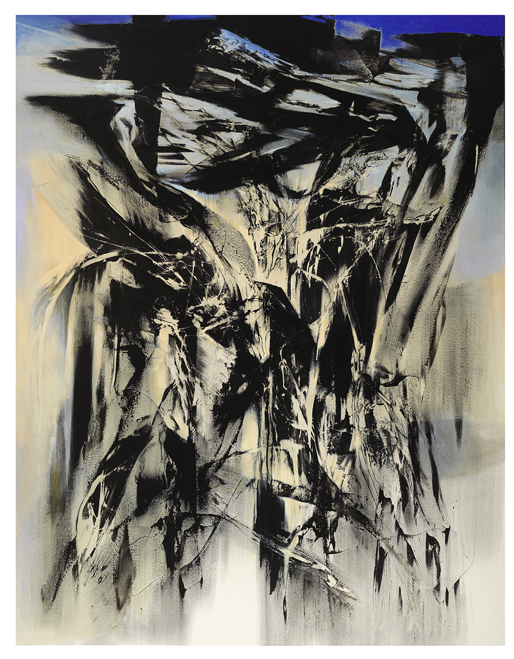 作品《乾坤》和《山河岁月》创作于2016-2017年,画面中凝聚天与地、山与水、昼与夜,白与黑等张力性的表现。以黑色性的书写、韵律感的传达为基调,通过肌理、线条、形与色彩,隐约的山水云气的意象与天地圆融,表达着空间关系。