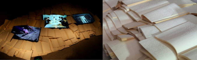 我是范勃,我参加“同一双眼睛”展览的作品是《世界³》和《无题》。《世界³》这件作品由无数扎满盲文的印刷品构成,而它们同时也是无视觉感知能力的人的日常记录本。这些现成印刷品,是我通过对数个无视觉感知能力的人家庭的追踪调查,将无视觉感知能力的人,用于记录日常生活的盲文记录本,诸如菜谱、歌词、地址、电话号码、信仰、诗歌等,并将它们收集到一起。这些纸张,来源于各个不同时间段的广告、杂志、图片、日常政治文本、房地产推销书等印刷品。印刷品本身的内容,恰恰巧妙地反映了所在地的城市化进程。虽然只是一种无视觉感知能力的人生活材料的基本呈现,但也可以从材料中看出,无视觉感知能力的人,在生活中处理信息所用的材料,所映现出的时代面貌。尽管对于他们来说,只有简单的纸张功能。而盲文本身同纸张印刷的信息分属两个世界,两者之间没有任何关系。重要的是,这两个世界在此交汇了。而对于观者而言,观看作品的过程本身,却又会对这份世界的交汇进行再次分离。在这些图像中,都可观看到图像与盲文之间的连接。在《无题》中所呈现的,是无视觉感知能力的人通过具体语言的方式,表达其对于生活的感知。在观看及听取他们叙述的过程中,观众、听众和他们一样,实际上是通过言语所激发的想象来感受他们生活空间的景观。在这种塑造中,需要视觉感知能力的想象,在这里通过言语文本来转移。由这两件作品所形成的链接,它同时成为了一个可进行多重阅读的场域。在这里,观看的读者、触摸的读者,皆可通过作品中所建立的双重阅读系统,来理解作品所提供的现有景观。也可自我再造景观,再造属于自己的想象。这种对文本的自主改写、可变组合,使阅读可以在两个不同认知系统中穿行。我们可以在文本中想象,通过想象来书写。在这件作品中,通过视觉化的改写再造,得以交叠盲文文本景观想象,使不同的认知系统,打破原有的认知边界,即为我所实验的方法之一。所有的作品在这里,似乎都可阐释图像与盲文之间的可连接关系,看似为了另建一个有意义的世界,但实际上作品是对这种关系的否定。当我们面对不可认知的盲文时,仅能将其作为有意义的图像进行解读与阐释。而过度的阐释,正在使观看失去其敏锐的感受力。对于视觉艺术作品,从观看到阅读,从欣赏到理解,从感觉世界到意义世界,无论对艺术家还是接受者,都面临着一次观念的转换,同时也面临着对语言系统的重新建构。作品不再是单纯的审美对象,而是在不断审视的过程中,反复处理各种含有不同信息的符号,将视觉形式文本化。图像作为有限的信息符号,被无限地阐释和阅读,而视觉的感知能力正在丧失。我正试图借另一种符号的不可读,来限定阐释的能力,或说,限定阐释的绝对权力,使观看不仅限于阐释,图像不仅限于符号化,这也是我创作转换中的重要思考。