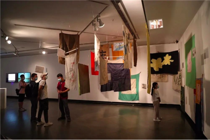 大家好,我叫卢珊,参加“同一双眼睛”展览,我的作品名字叫《粮库》。粮库是我小时候长大的地方,全称叫“中国湖南粮食储备库”,其实地方挺隐蔽的,就是要通过一个洞,就进入到这个国家的粮仓。小时候我就是会在这个隧道里面,就是特别的开心,跑着跑着那个口就越来越大,然后左转就到了粮库,粮库其实有自己的一个铁轨,因为有很多的那个火车的车陂里面装满粮食,就是会运到这个地方,还有一个加工厂,就是分这么两块。我小时候和爸妈住的那个宿舍楼里面,就是分到多一个比较大的房子,那个时候还用那种热水瓶这种东西。很小的时候楼下奶奶就会带着我们在外面乘凉,在一个斜坡上讲一些民间故事,晚上周围都是萤火虫。很小的时候,我就很喜欢在仓库里面玩,在一堆米里面打滚,然后爬仓库的拱门,然后喜欢去那个火车的轨道看运粮食的火车,然后看火车的车厢里面,躲进一堆堆米的麻袋中间。年前的时候,我回去了一次,就看望了那个邻居奶奶,我也画了一些现在的粮库的一些纸本。我将这些纸本,还有一些大量的布的一个实验、一个作品带给大家。其实,就是很小的时候,一到下雨的时候,叔叔阿姨就会带上那种防雨帆布,然后把那个仓库里面的米全部地支撑起来,就是将那种防水的那种布,帆布啊,面粉袋呀,还有那个麻袋啊,基本上构成了整个小时候对仓库那么一个印象。然后我从家里面把我妈妈存的一些这种面粉袋拿出来,然后重新地,就是把基本上能够回到的,比如说这个老奶奶,还有那个打架的狗,还有那种小时候的玩具什么的,就是将它整个用布的方式去做了这样一个作品。然后现场大家看到的这个悬挂的方式,其实是希望当你进入到这个作品的时候,有一种扑面而来的回忆,然后大家其实也可以通过触摸,可以不同的这种感受,就是同一双眼睛,可能有不同的感官。即便是看不见的朋友也可以通过这种麻布和帆布,或者是面粉袋的这种质感,去感受到那个粮库的这么一种记忆、一种温度。然后我的这个作品, 其实用了一些我没有用过的一些方式,就是做了一个印的方式,比如说还有画的方式,还有那个缝纫机、刺绣等等,就是基本上整个尝试了一遍。所以观众进入到这个作品的时候,其实更多的是去感受到这种整体感比较强一点。然后在这个布的尺幅大小,其实也会比较丰富。然后有一些是以前的衣服,然后我给它做了一个比如说留下一些扣子把它缝起来,这个其实都是一些细节的表达吧。但是,更多时候如果你看到这个作品的时候,其实有一种粮库的味道,就还是有一点点这种阿米啊,或者是一种小的这种这种感受,所以希望通过这个作品让大家其实会对记忆也好,或者是感受也好,有一个更加的加强感,就是会让大家代入到那个时候,分享我的这种感受,然后我也特别希望奶奶也能够听到这个东西。