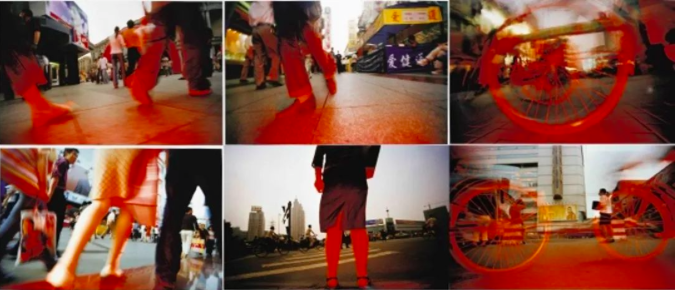 我是莫毅,我在“同一双眼睛”展览中的作品叫《红色闪光灯 我是一只狗》。它是2003年创作的,是这样进行的:第一,给照相机装上自动卷片器。2003年这个数码时代还没到;第二,装上一米多长的这个气球快门线,为了拍摄的时候,把这个气球快门线捏在手上;第三,给散光灯加一个红色塑料片,这样,这个闪光灯发出的光就变成了红色。所以我们看到这个画面中的红的颜色,不是后期的,而是拍摄当中这个闪光灯的这个光芒,这个进而上去了,所以近处的颜色就会变成红色,但是远方依然是自然的颜色。然后这个第四,是把照相机在固定到这个独脚架上;第五,倒提着独脚架的另外一端在城市当中行走。那个年代,我开始考虑一些问题,这个实际上从95年我开始有了一些认识,我突然觉得用眼睛的拍摄是对世界的观看和选择。拍摄,实际上就是观看和选择。但选择就意味着评价,而那个时期,我觉得文明还能评价吗?比如,今天我们看这个手机和汽车,只有当我们受伤时,才知道美女和魔鬼原来一体。那么这个画面的低视角了,其实不是为了模拟狗的观看,而是借用了这个人类认为动物从来不能评价、不能思考的这样一个认识,实际上要的是狗的态度,或者是人以为狗是如何的。反过来,在骂人所创造的这个世界和社会,是这样子的。所以这个作品,不再去观看和评价外界,而是观看自己的行为和方法,与这个世界碰撞的时候所出现的种种可能出现的样子。