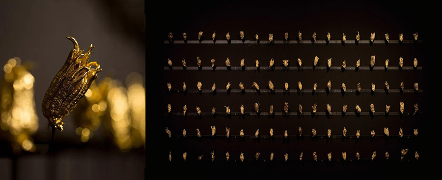 北京天干,佛手迅速萎缩,再萎缩,渐如石头般坚硬,如蝉蜕般轻巧,表皮发黑起皱,却仍保有姿态和香气。我想起坐化的僧侣,那就把它们镀金身吧,辗转找到为佛像贴金的汤师傅,试用传统工艺做了四五只。2016年秋,在朋友的朋友邓超峰帮助下,三百多只佛手运来,放工作室仓库晾晒,遭遇水管爆裂,废掉大半。第二年超峰又数次下田,再选三四百个,仔细包好寄来。