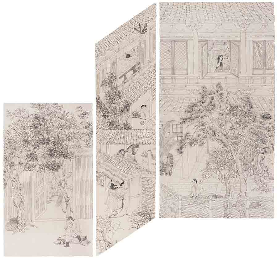 我从16年底苏州博物馆个展开幕前开始晒和拍摄,到19年秋,三四年间,东奔西跑,生活天翻地覆。《七个夜晚》、《平沙落雁》、《窥》、《故事新编》、《梦中人》多是卷在路上,得空就画。在北京的时间不到一半,每次回工作室,进仓库,看看佛手,静静挂在架子上,萎缩再萎缩,发枯发黄甚至发黑,仍保有姿态和香气。